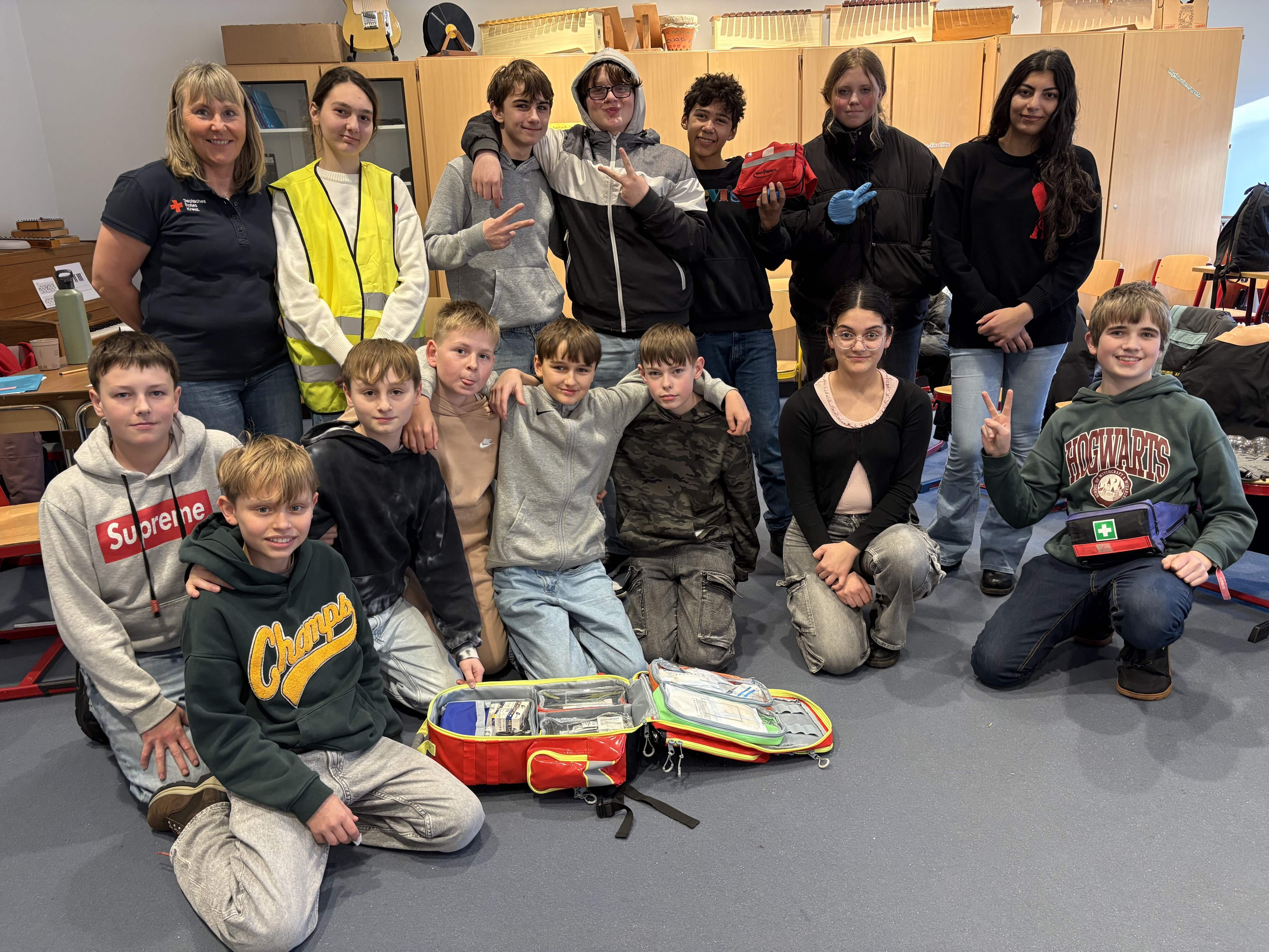 Vor Kurzem wurden die neuen Schulsanitäter ausgebildet! Frau Kretschmann vom DRK ist dafür extra einen ganzen Tag an unsere Schule gekommen und hat uns Vieles gezeigt. Wir lernten z.B. die stabile Seitenlage, Mund-zu-Mund-Beatmung und wie man Wunden behandelt, ohne ohnmächtig zu werden. Wir konnten viel ausprobieren und hatten großen Spaß! Ab sofort sind wir z.B. in den großen Pausen für euch da! Wir freuen uns darauf, euch zu helfen! Geschrieben von Lotta aus der 7b