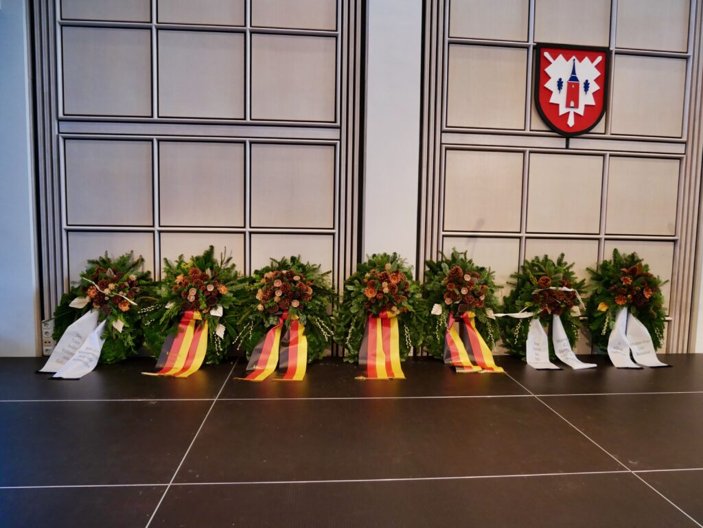 „Die Erinnerung behalten und übertragen in die Krisen der heutigen Zeit!“ Dies sei laut Bürgermeister Stefan Bohlen ein wichtiges Ziel, wenn wir an die Opfer der beiden Weltkriege und an die Krisen der heutigen Zeit anlässlich des Volkstrauertages denken. Um diesen Tag feierlich zu begehen, lud er die kaltenkirchener Bürger ins Rathaus ein und wurde bei der Programmgestaltung von Schülerinnen und Schülern unserer Schule tatkräftig unterstützt.