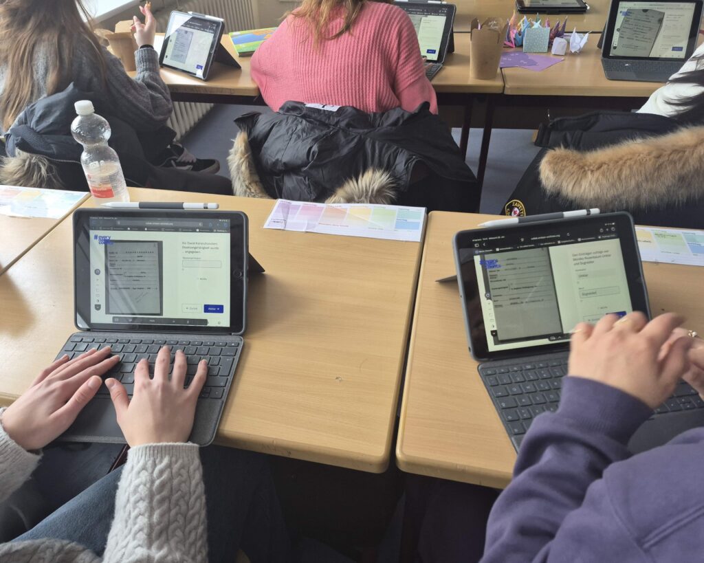 In den vergangenen Wochen arbeitete die Klasse intensiv an historischen und aktuellen Menschenrechtsfragen. Ein Schwerpunkt war die Biografie von Werner Eckstein, der als sogenannter „Mischling 1. Grades“ ausgegrenzt, im KZ‑Kaltenkirchen inhaftiert und zur Zwangsarbeit gezwungen wurde. Die Verbindung seiner Lebensgeschichte mit der UN‑Menschenrechtserklärung machte eindrücklich deutlich, wie fragil Freiheit und Würde sein können.