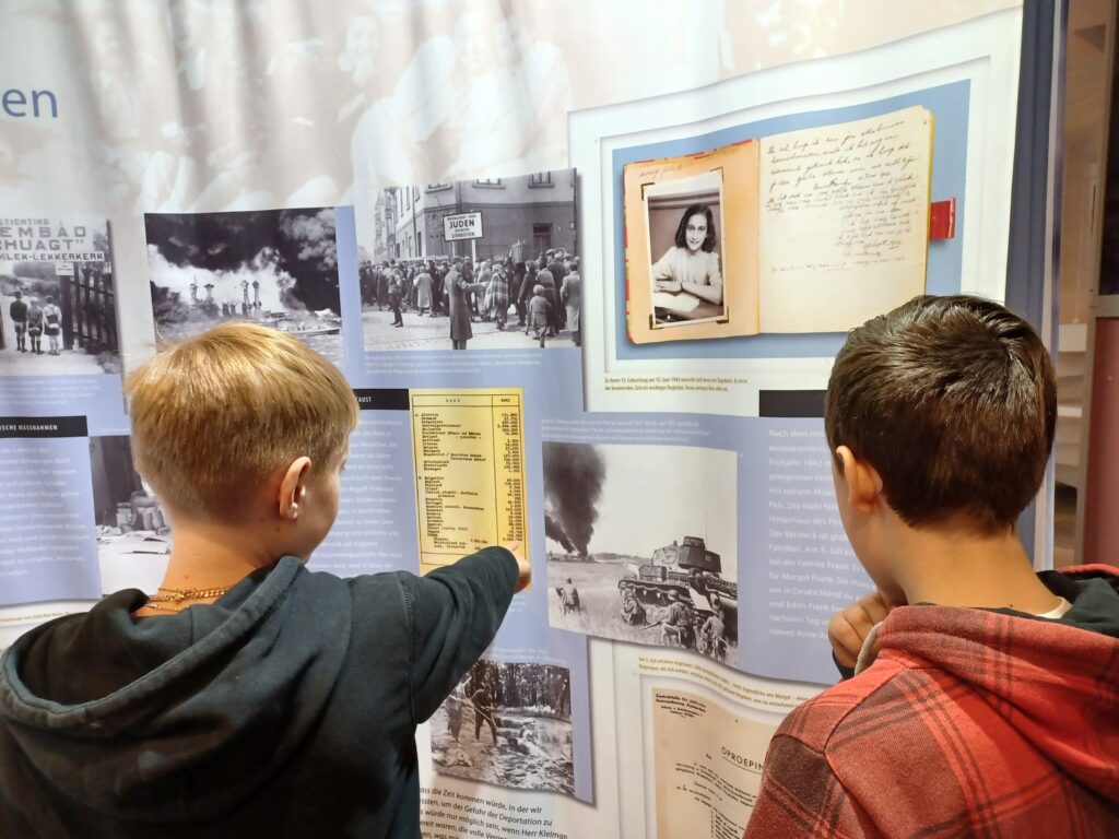 Die Ausstellung empfing die Gruppe mit eindrucksvollen Bildern, Zitaten und interaktiven Elementen, die Anne Franks Lebensweg nachzeichnen: von ihrer Kindheit in Frankfurt über die Flucht vor den Nationalsozialisten bis hin zum Leben im Versteck in Amsterdam. Besonders bewegend waren die persönlichen Gegenstände und Tagebuchauszüge, die Anne nicht nur als Opfer, sondern als kluge, reflektierende junge Autorin zeigen. Ihre Gedanken über Freiheit, Angst und Hoffnung berührten die Schülerinnen und Schüler tief.